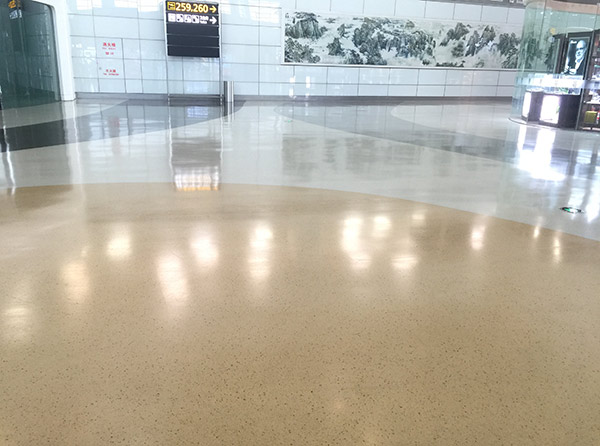 3、面涂層:環(huán)氧磨石涂料拌彩石攤鋪、刮平。固化后,用專用機(jī)械打磨平整、拋光。